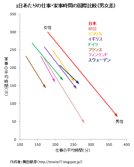この線が短くなる、ということは男性の労働時間の削減&家事時間の向上(ポイントが左上に移動)。